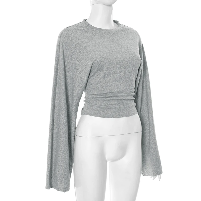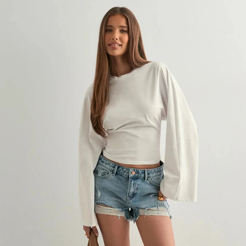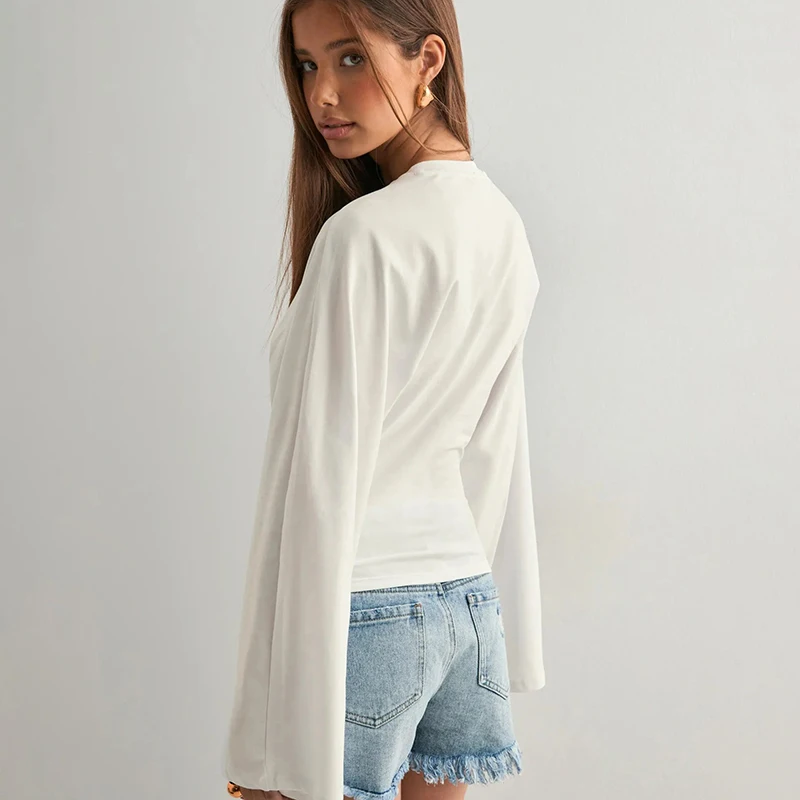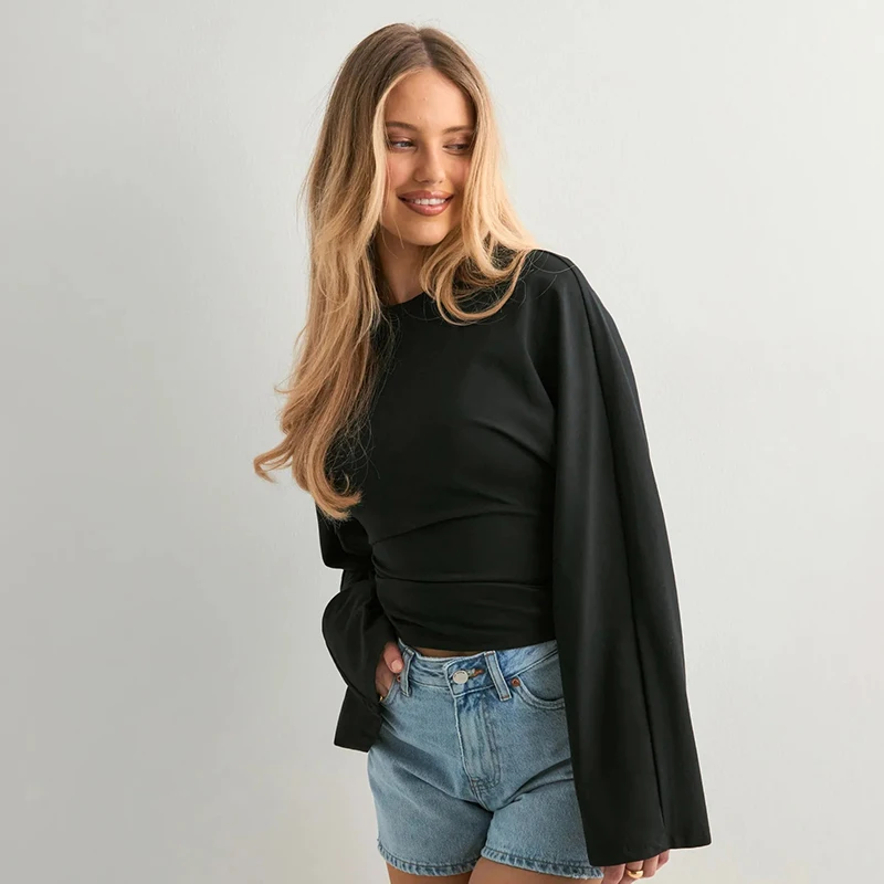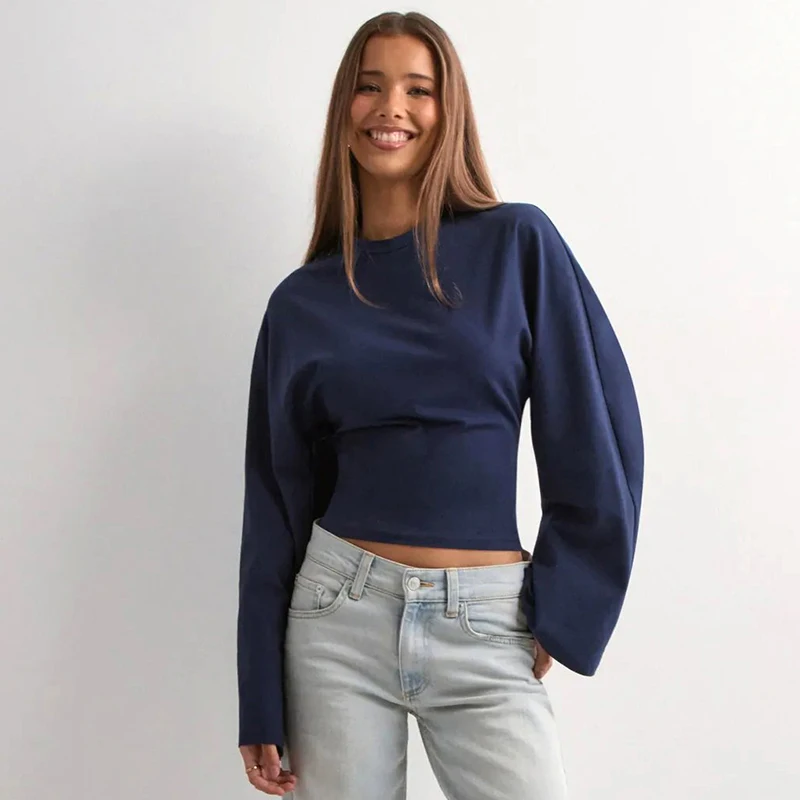 CUTENOVA Women Solid Color Round Neck Front Shoulder Wide Long Sleeves Cinched Waist Slim Top Daily Casual Simple Versatile Tops