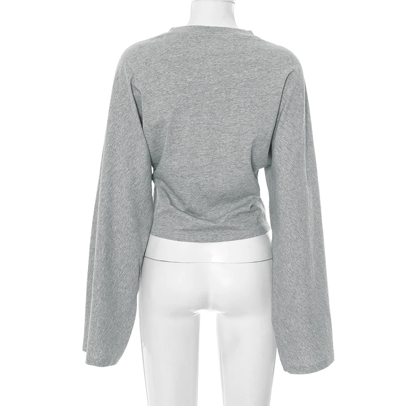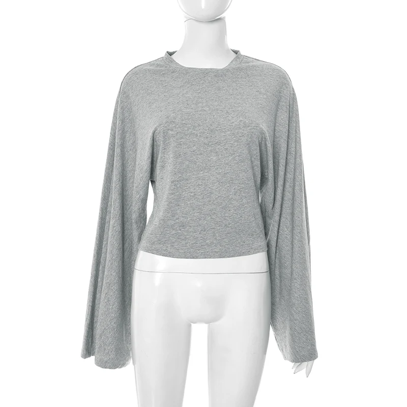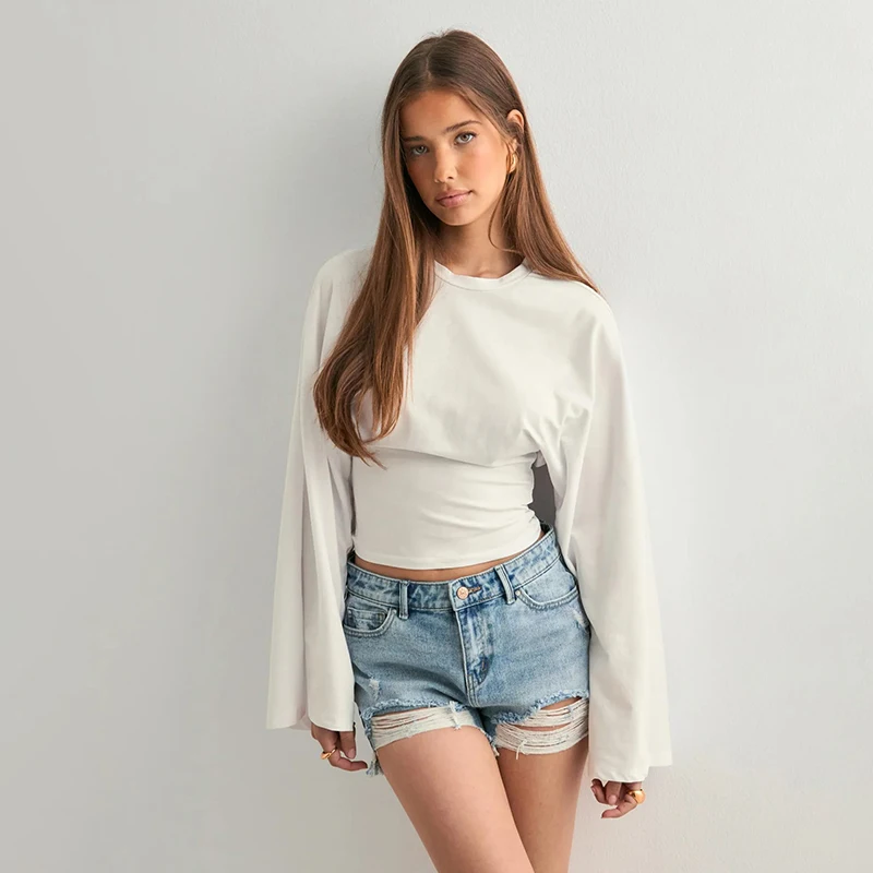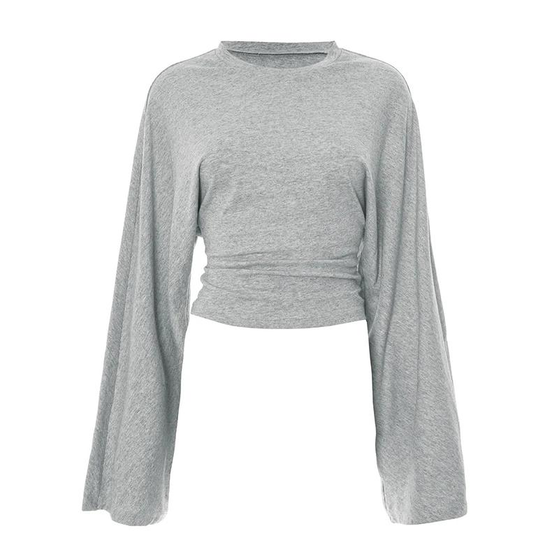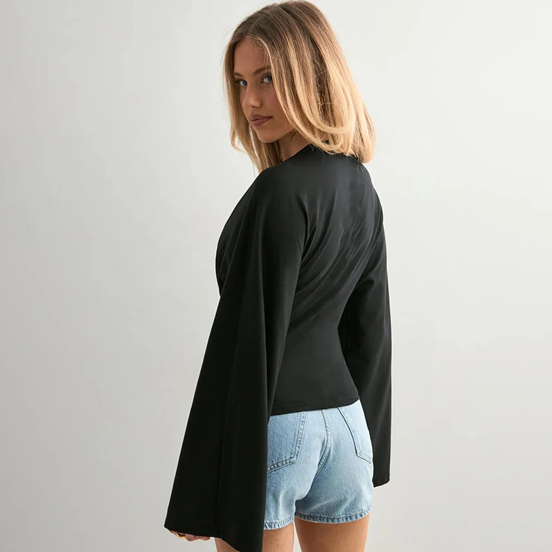CUTENOVA Women Solid Color Round Neck Front Shoulder Wide Long Sleeves Cinched Waist Slim Top Daily Casual Simple Versatile Tops