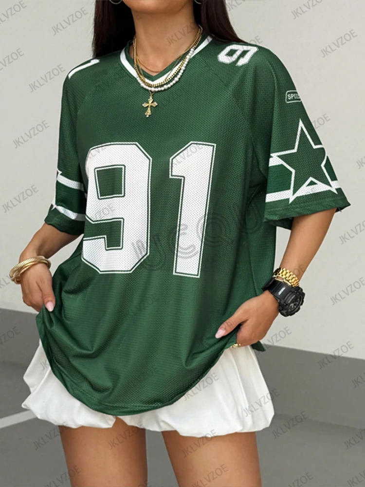 Summer New Black Speed 91 Print T-Shirt for Women V-Neck Patchwork Short Sleeve Sports Football Jersey Y2K Loose Oversized Tops