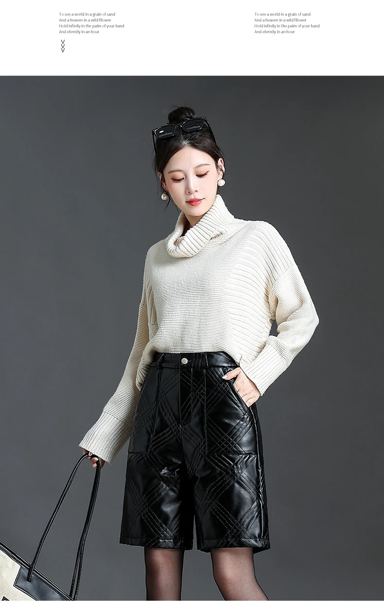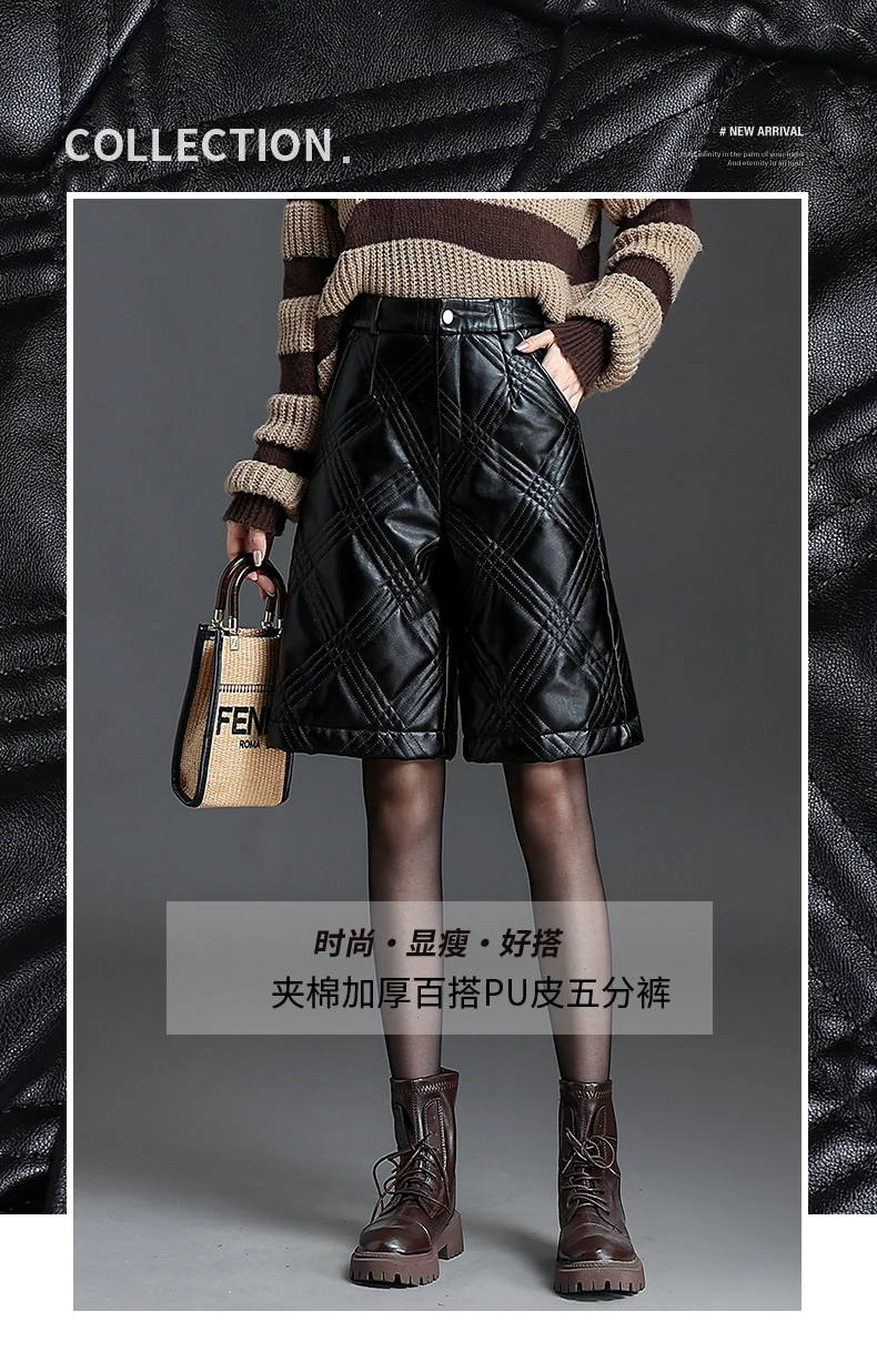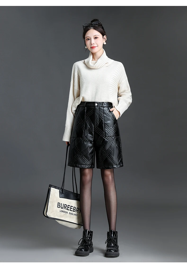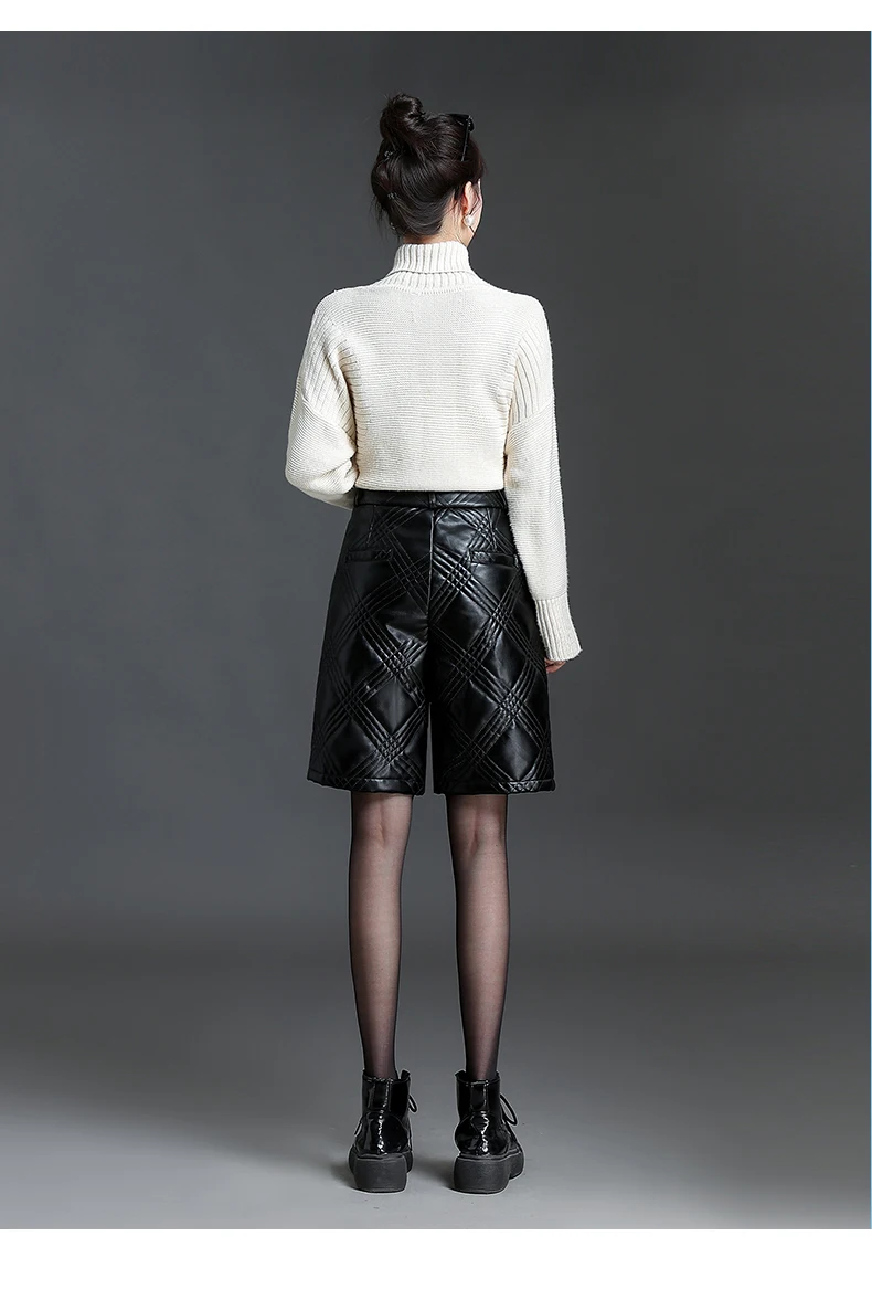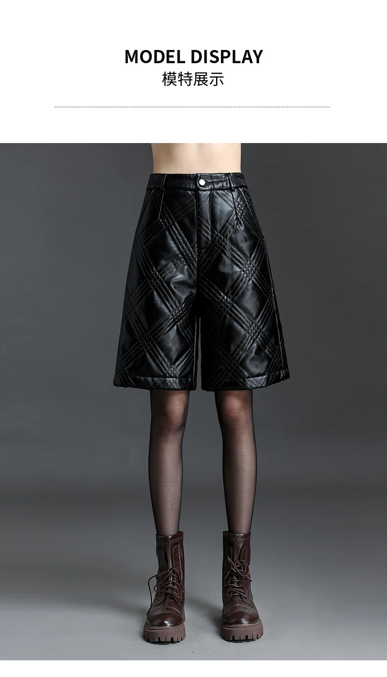 ZUZK Warm Black PU Leather Thick Bermuda Shorts For Women Winter Knee Length Shorts Motorcycle Punk High Waist Bermuda Femme