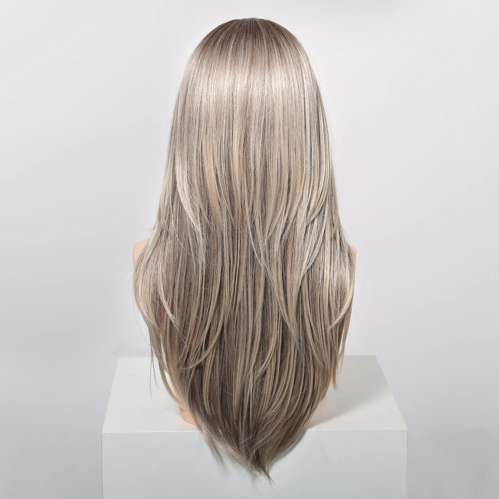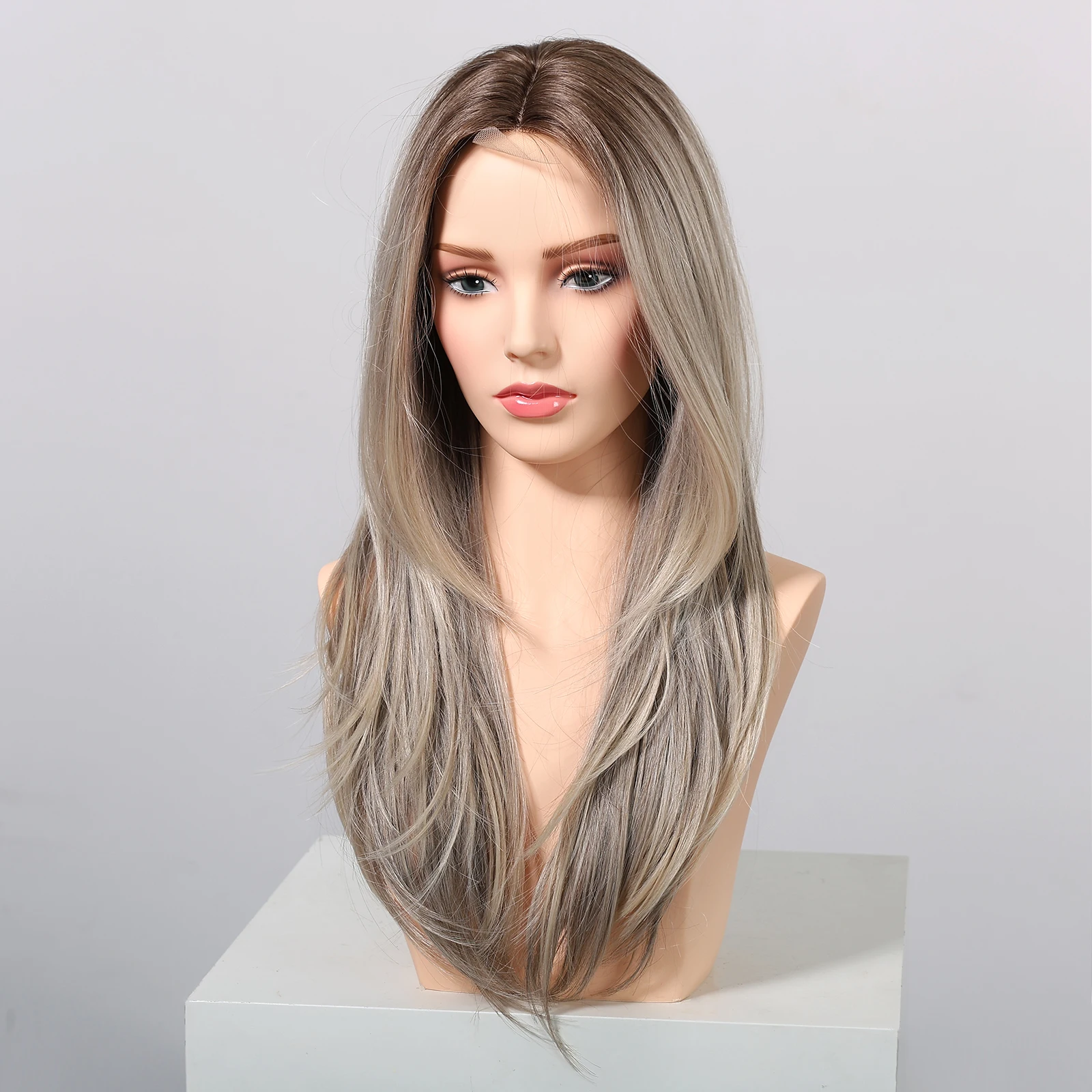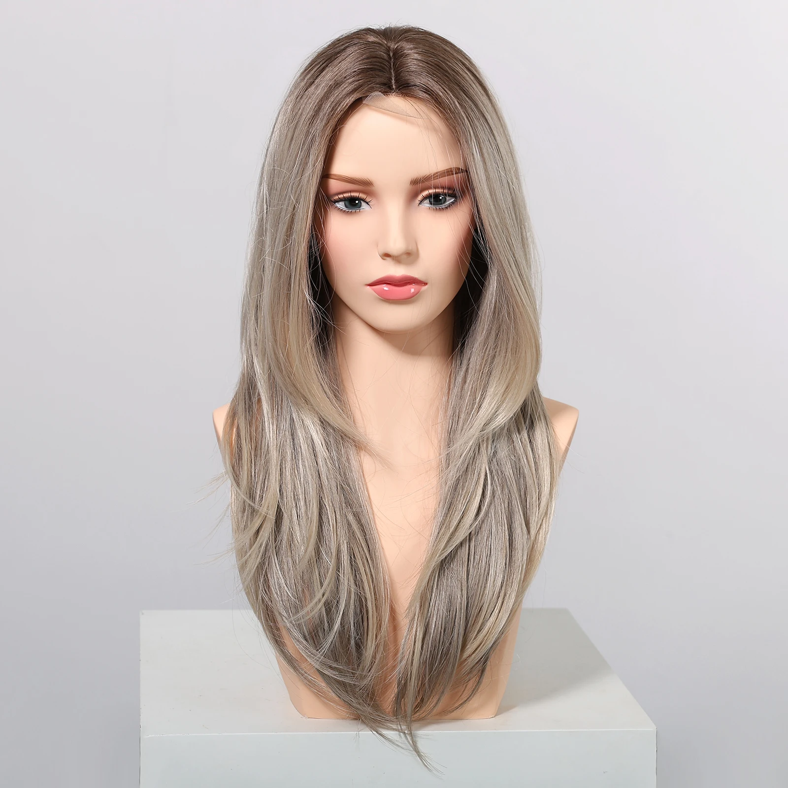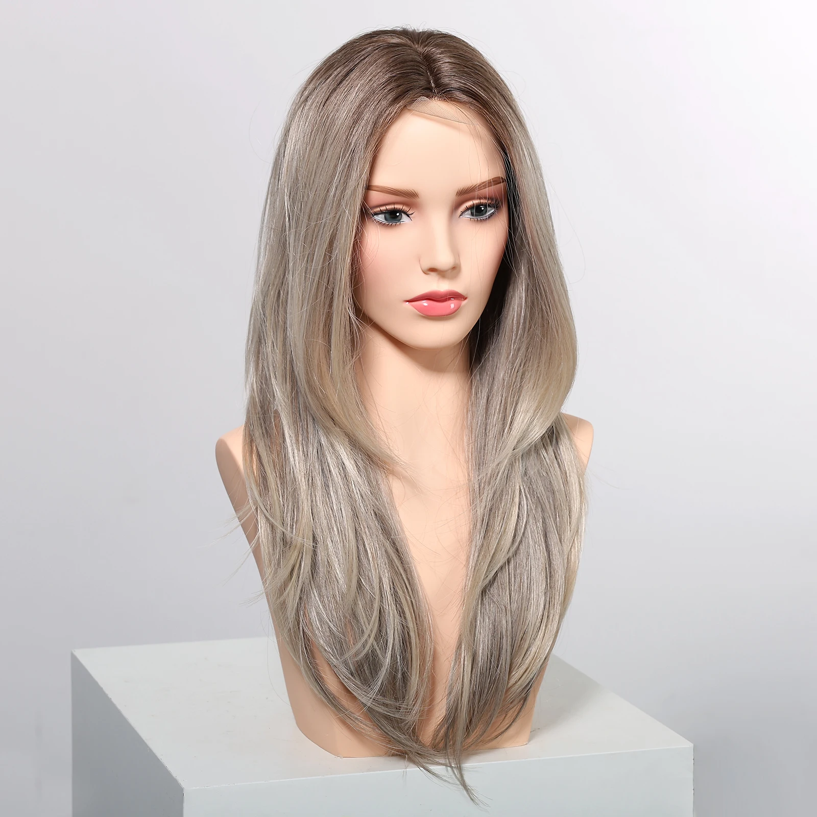 Gray Blonde Synthetic Wigs Dark Root Hairline Lace Frontal Straight Layered Wigs for Women Ladies Daily Use Wigs Heat Resistant