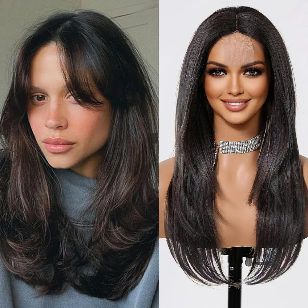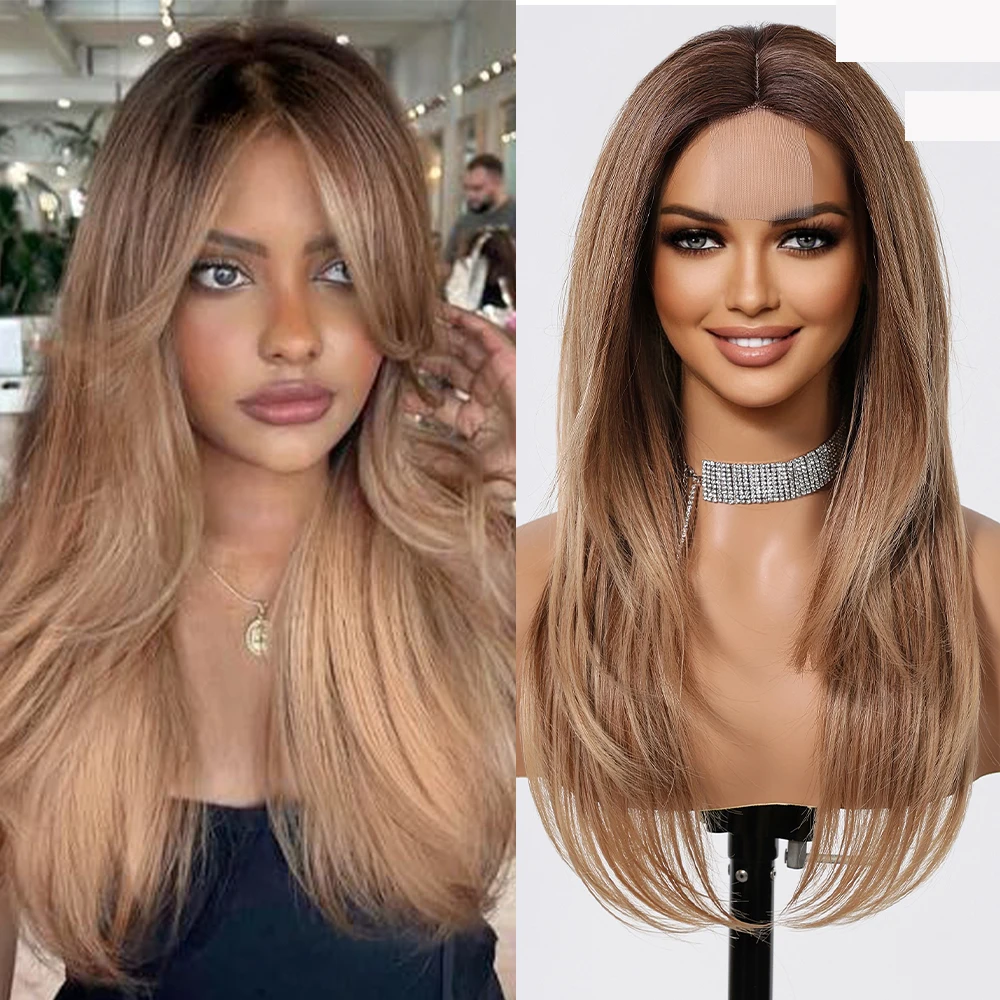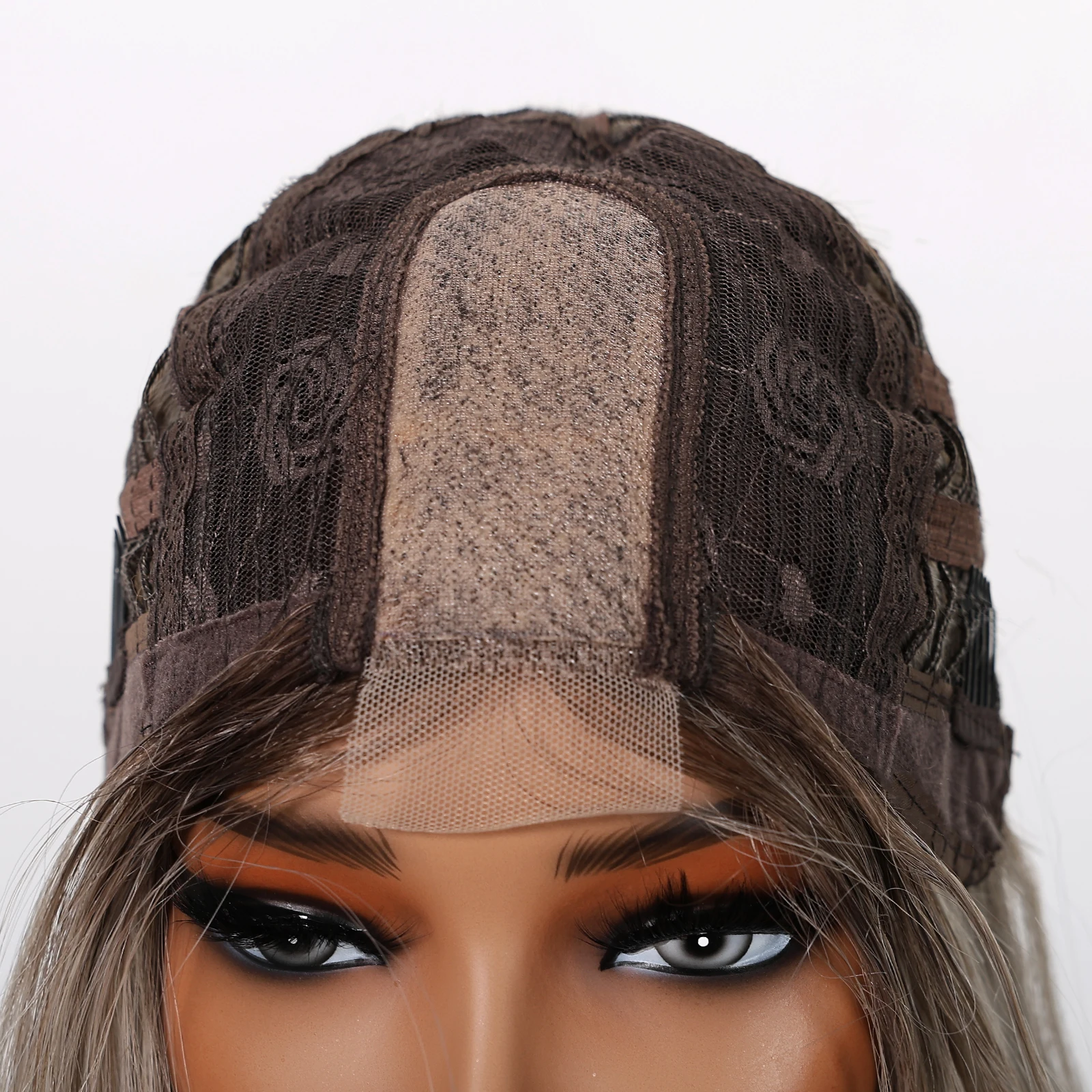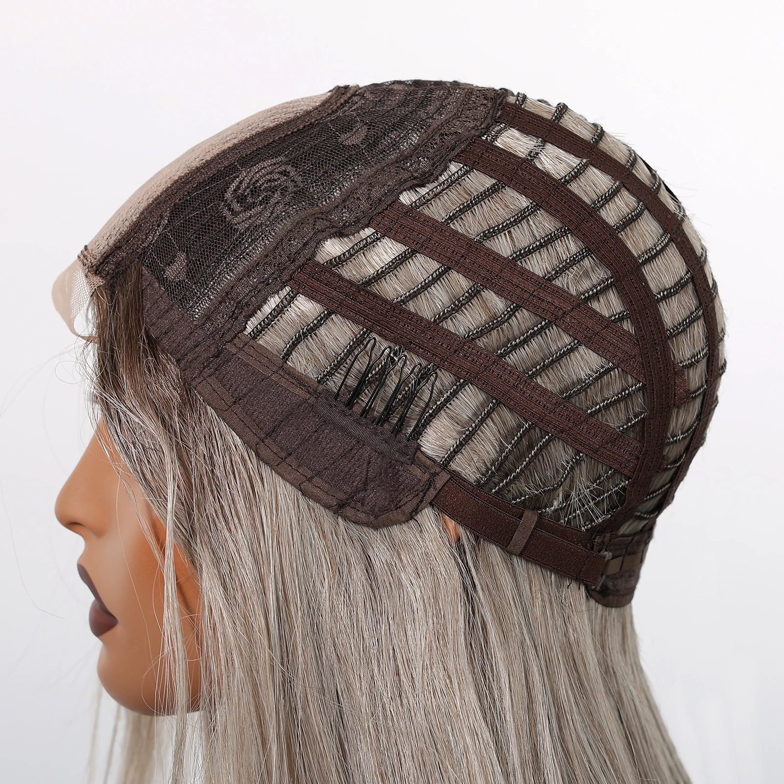Gray Blonde Synthetic Wigs Dark Root Hairline Lace Frontal Straight Layered Wigs for Women Ladies Daily Use Wigs Heat Resistant