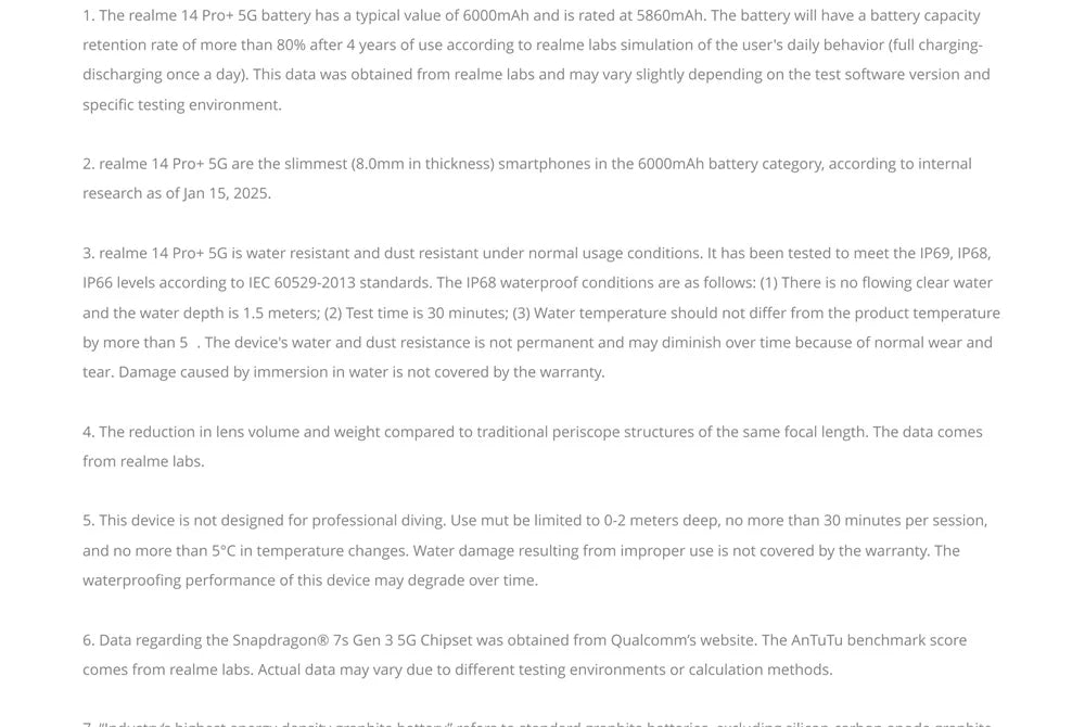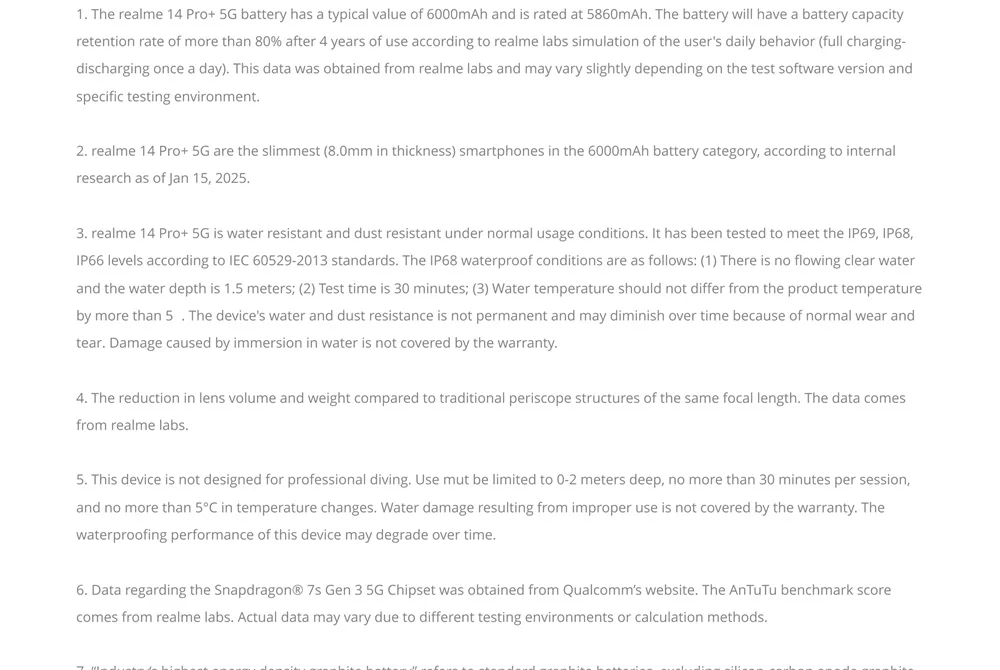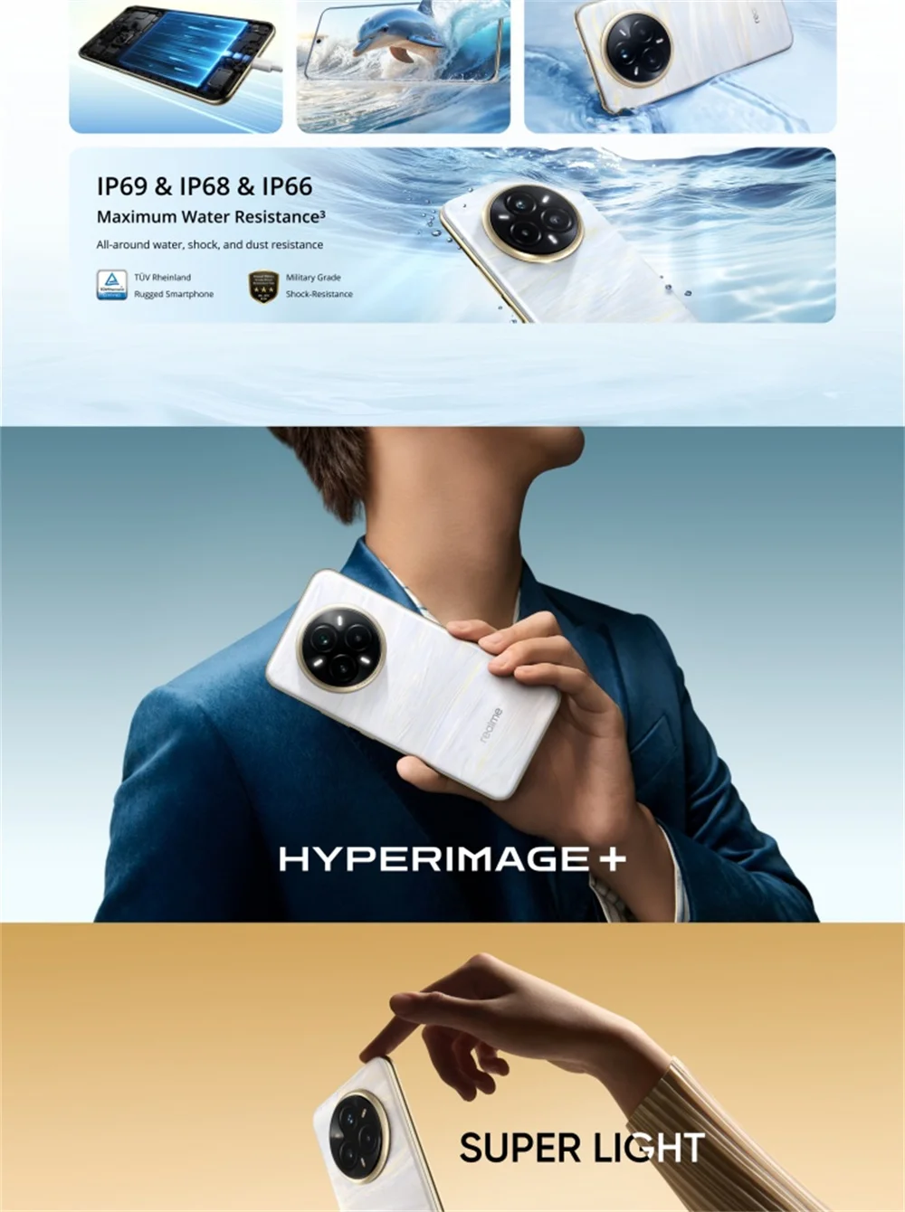 realme 14 Pro Plus is waterproof and dustproof under normal use.Under controlled laboratory conditions, after testing, its effect reaches IP69, P68, and IP6-levels under GB/T4208-207 (domestic) standards.Do not charge the mobile phone in a humid state. There are differences between the life scene and the experimental environment. Do not immerse the mobile phone in water for daily use, or come into contact with solutions such as seawater or liquids such as drinks.After being soaked in rain and splashing water, the liquid may block the sound output and radio pipes of the microphone, earpiece, and speaker, resulting in abnormal listening/radio during calls and external playback. After drying, let it stand to dry to restore function.The waterproof and dustproof functions may be reduced due to daily use loss.