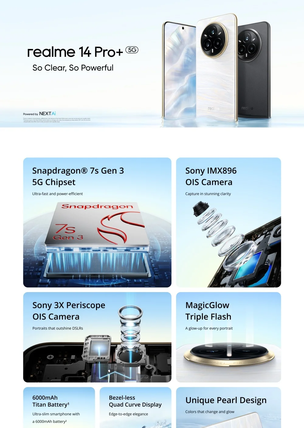 Standard Package: realme 14Pro Plus*1, USB Type-C Cable*1, 80W Power Adapter *1, Protect Case*1, SIM Card Needle*1, Quick Guide*1, Important Info Booklet with Warranty Card*1.