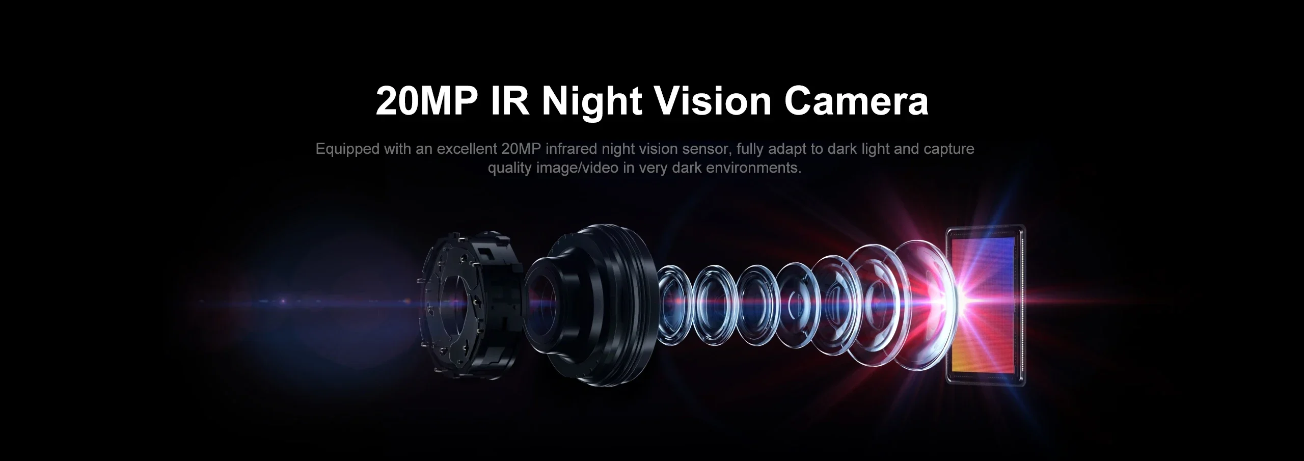 Equipped with an excellent 20MP infrared night vision sensor, fully adapt to dark light and capture quality image/video in very dark environments.