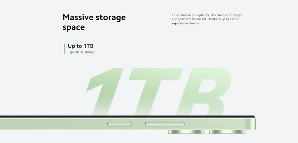 Easily store all your photos, files, and favorite apps and games on Redmi 13C thanks to up to 1TB of expandable storage.