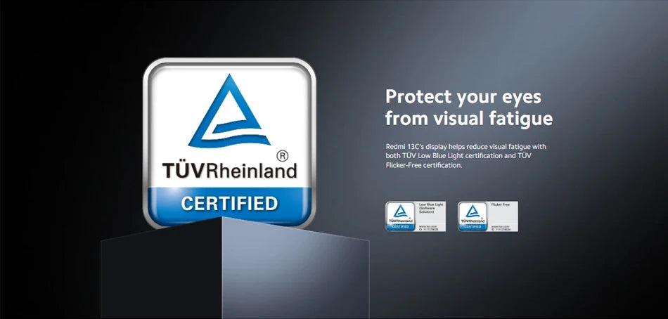 Redmi 13C's display helps reduce visual fatigue with both TUV Low Blue Light certification and TUV Flicker-Free certification.