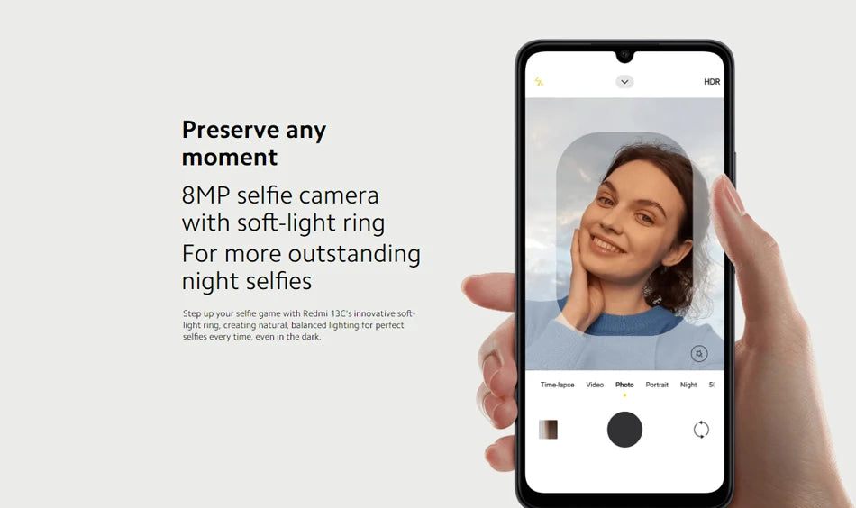 up your selfie game with Redmi 13C's innovative soft-light ring,