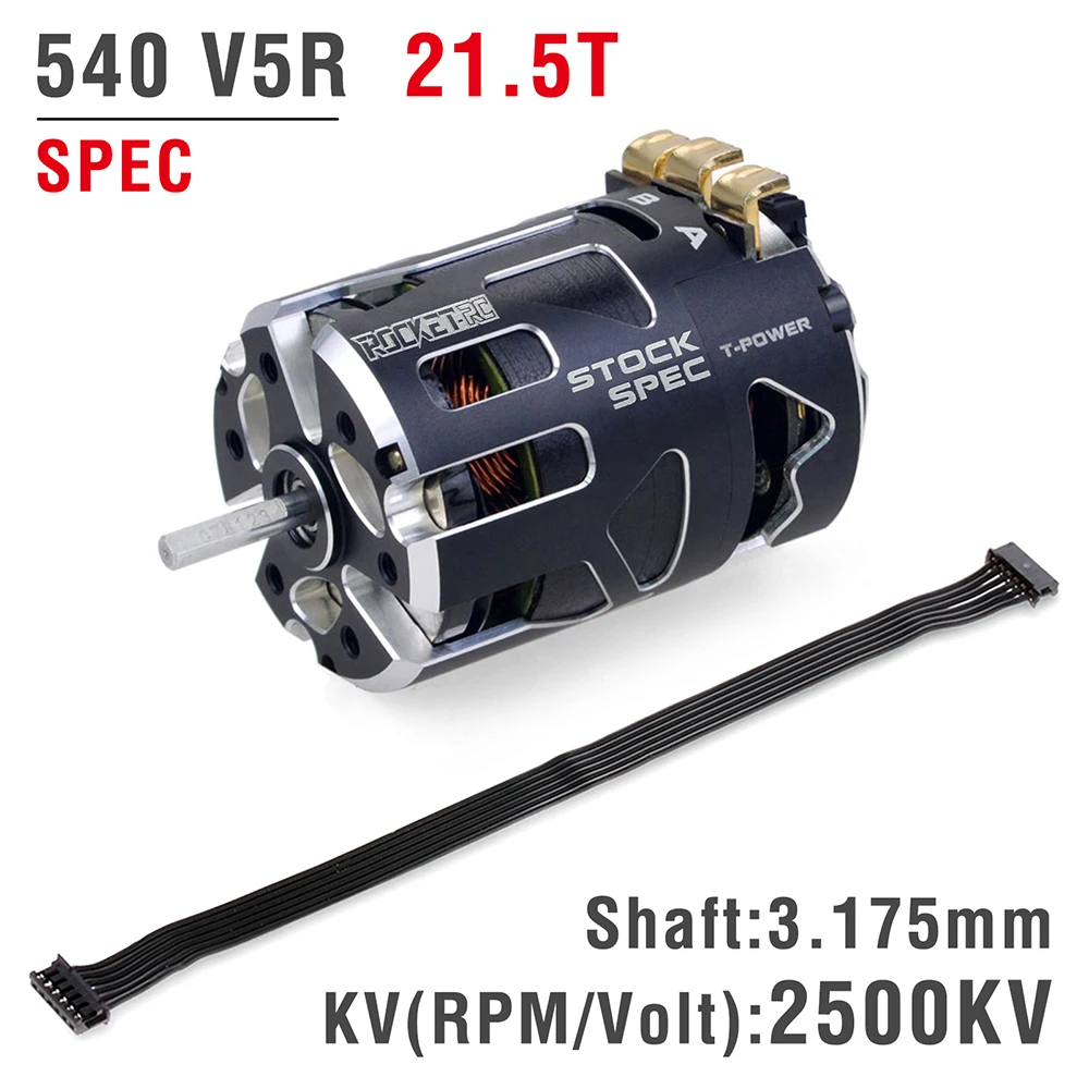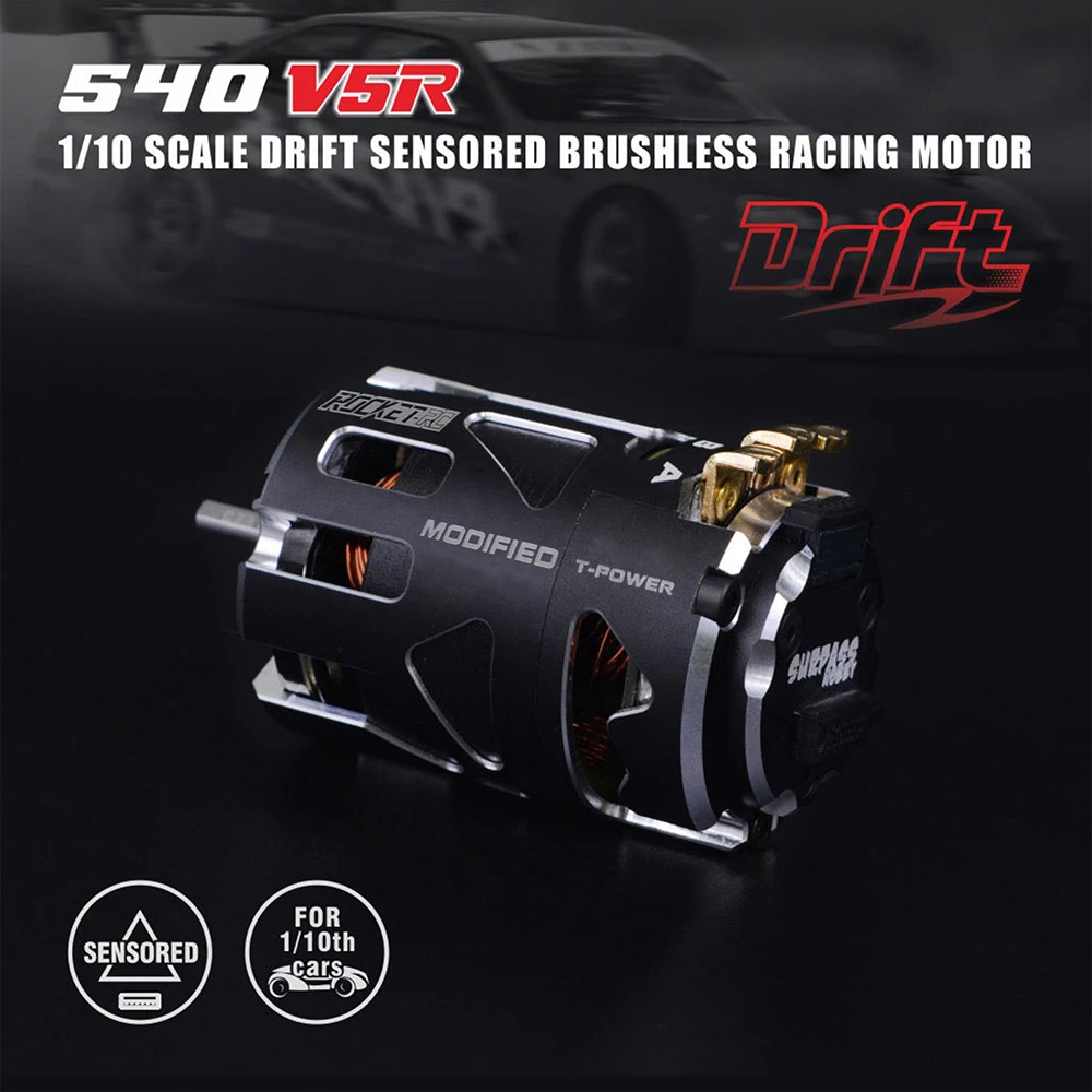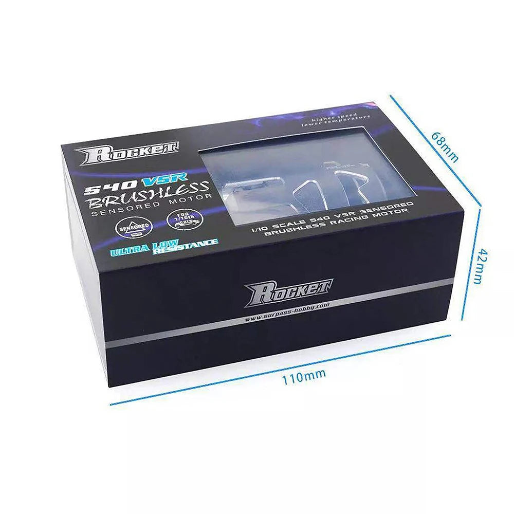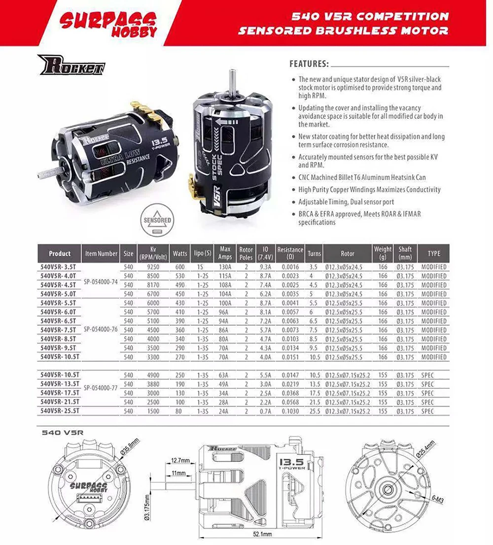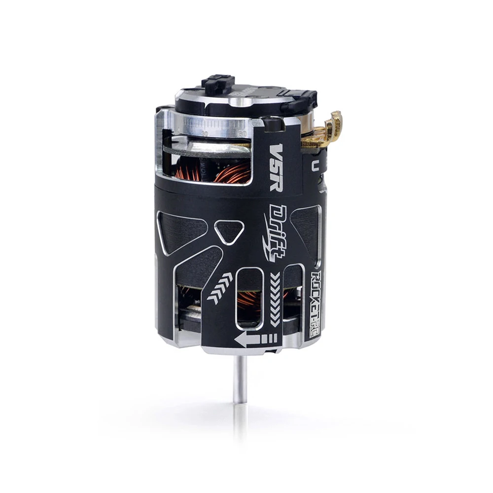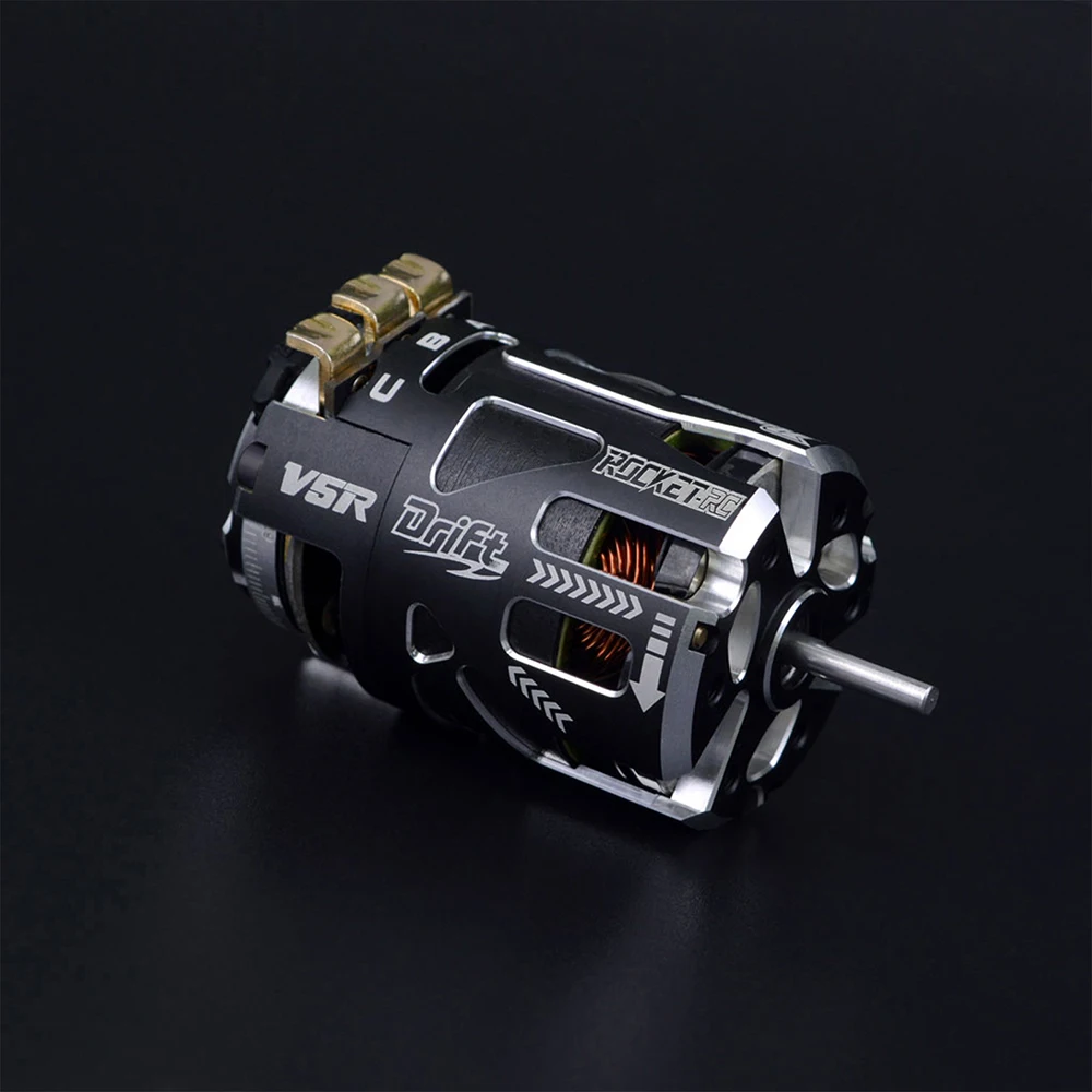 SURPASSHOBBY ROCKET 540 V5R brushless pole-speed motor meets the requirements of ROAR (USA) competition and IFMAR rules. It provides 3.5T 4.5T 5.5T 6.5T 7.5T 8.5T 9.5T 10.5T 13.5T 17.5T 21.5T for all kinds of T numbers. It is suitable for F1, 1/12, 1/10 off-road, drift and electric car races. CNC6061 aluminum alloy shell, induction line interface, aluminum tail cover; ultra-low internal resistance, improve motor performance and reduce motor operating temperature, optimize heat dissipation efficiency, disassembly and adjustable timing.