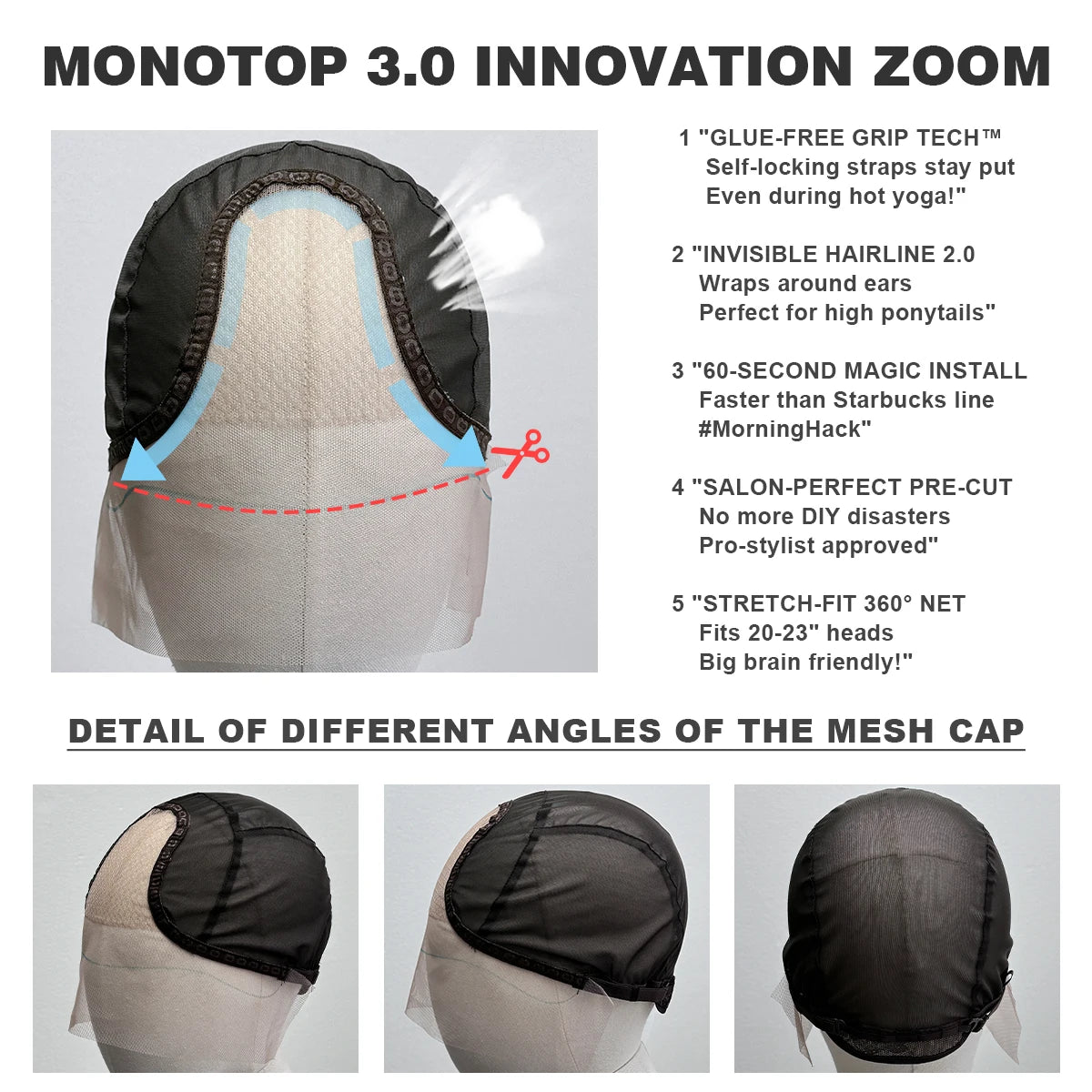cap type: Monofilament,elastic mesh cap
