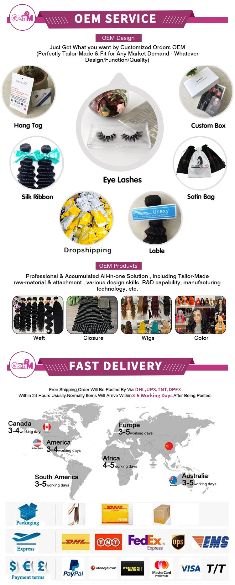 1、Stock lead time: 1-2 working days. 2、Customized size lead time: 5-7 working days. 3、Complex customized size & multi color lead time: 7-12 working days.