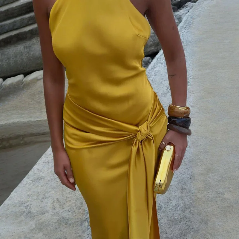 2025 Women Sexy Backless Solid Beach Dress Fashion Lace-Up Waist Slim Satin Long Dress Elegant Round Neck Sleeveless Party Dress