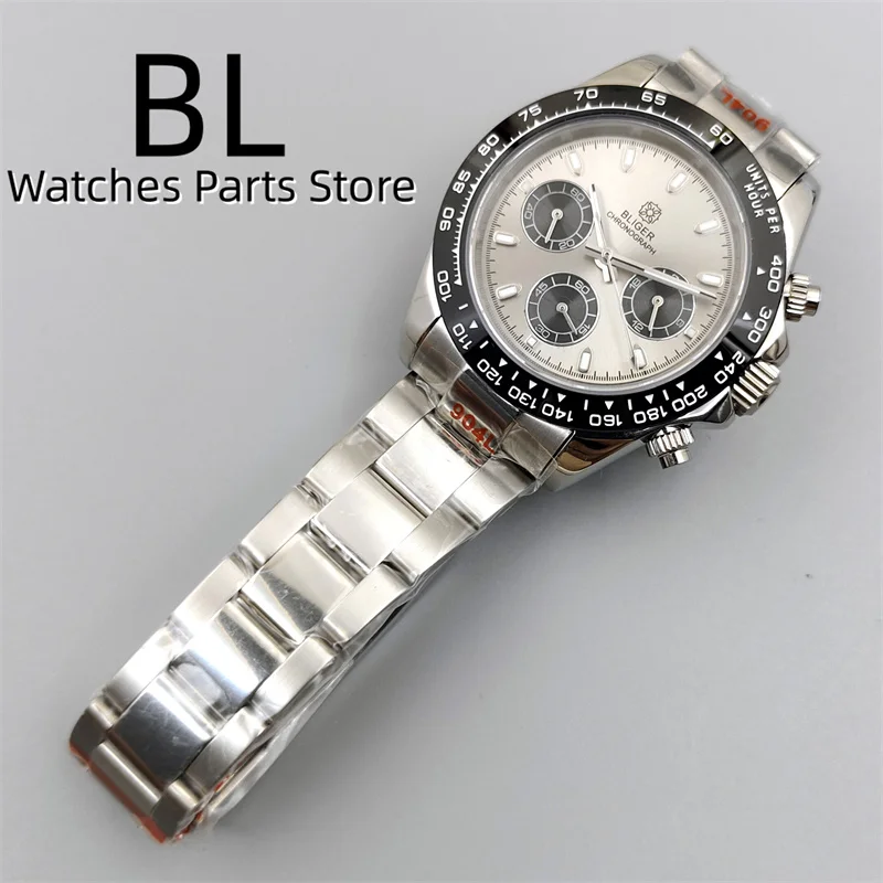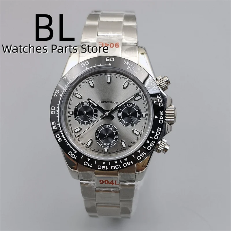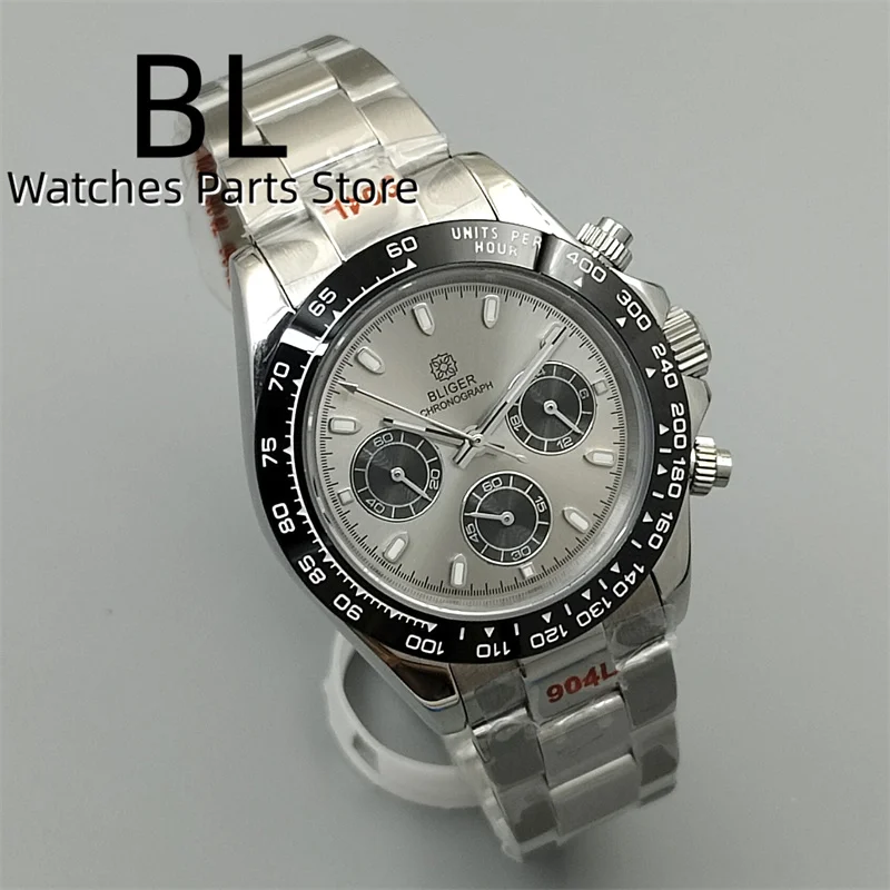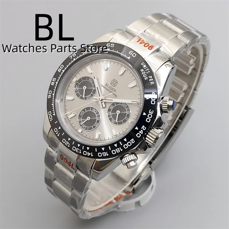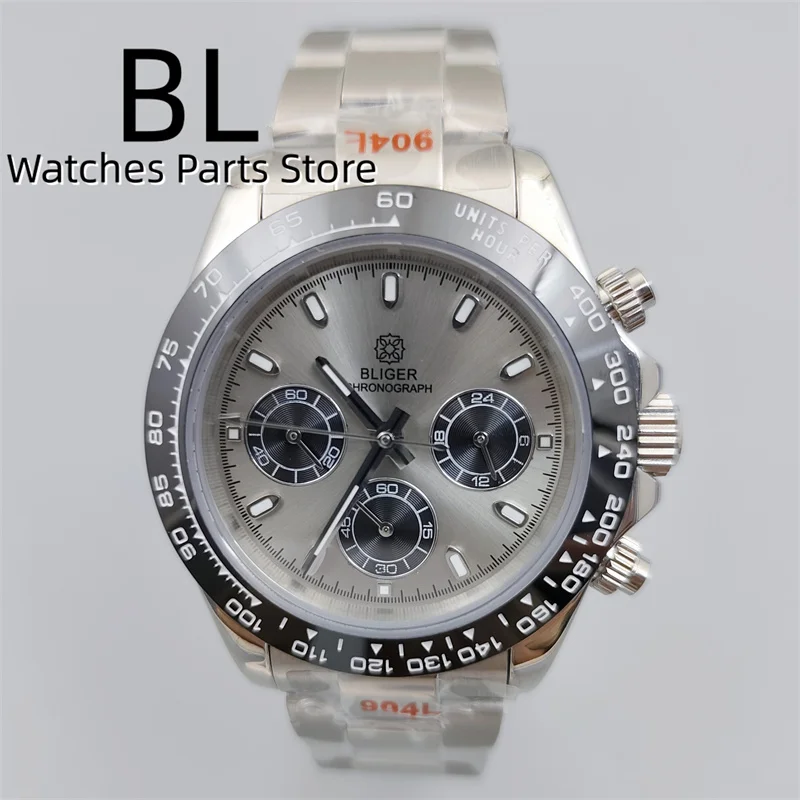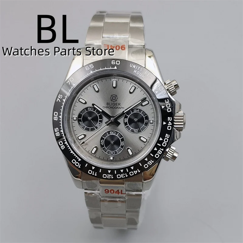 BLIGER/Sterile Gray Dial Chronograph VK63 Quartz Men's Watch 39mm Sapphire Case Black Bezel Luminous Stanless Steel/Rubber Strap