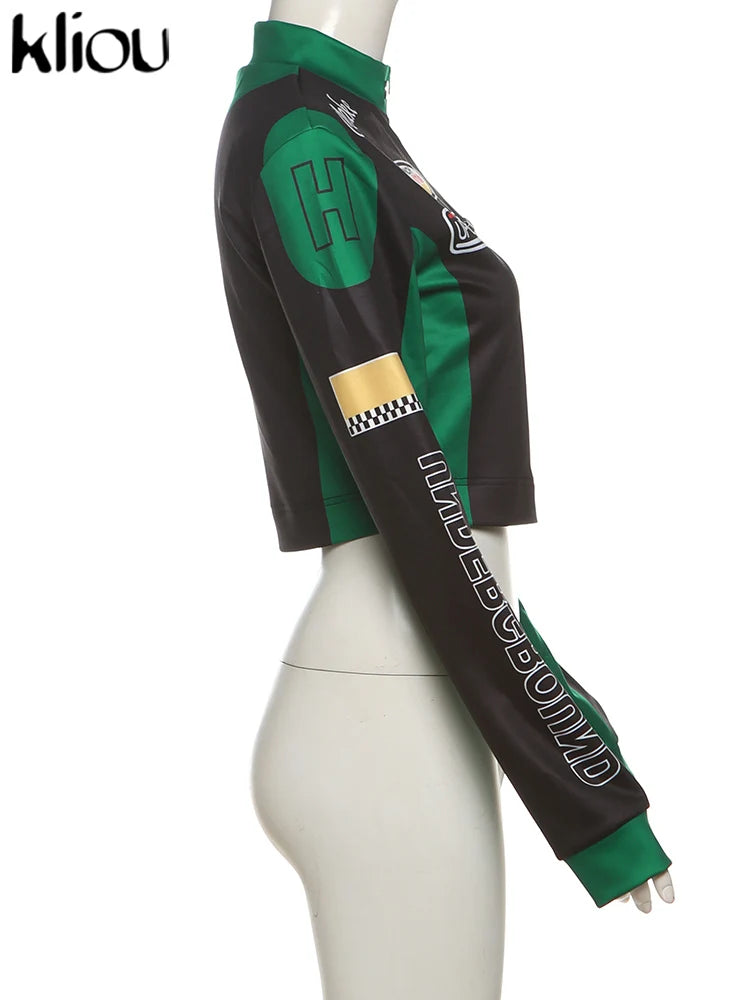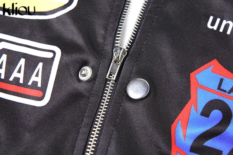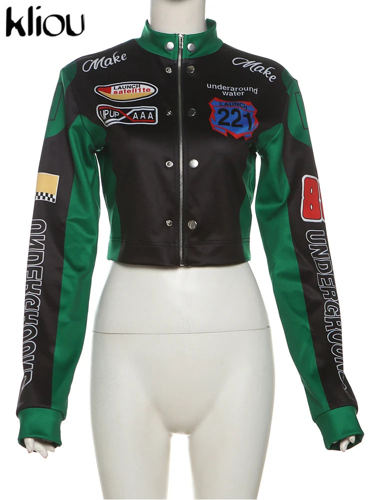 Cutenew Panelled Feather Women Coats New Letter Print Patchwork Buttons Full Sleeve Zip-up Crop Jackets Female Street Outwear