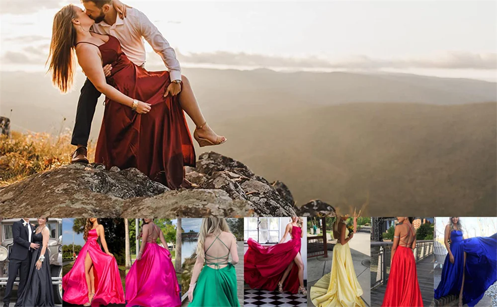 Elegant Women Maxi Beach Satin Dress Sexy Leg Slit Lace up Evening Prom Gown Adjustable Straps Bridesmaid Dresses